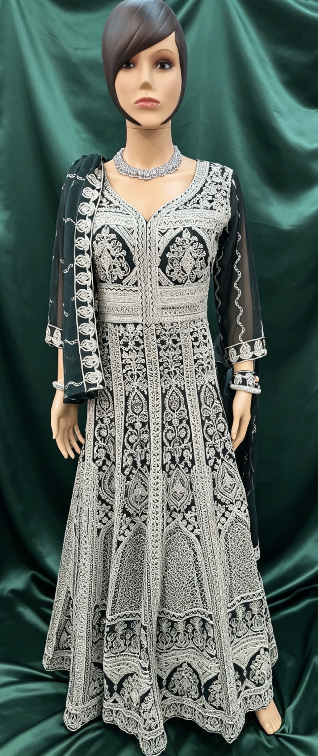 Donkergroene anarkali in maat 42. Collectie 2026. Mooie anarkali met mouwen. Er is stof/ruimte om deze 1 maat groter te vermaken.